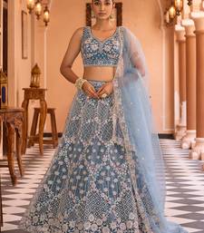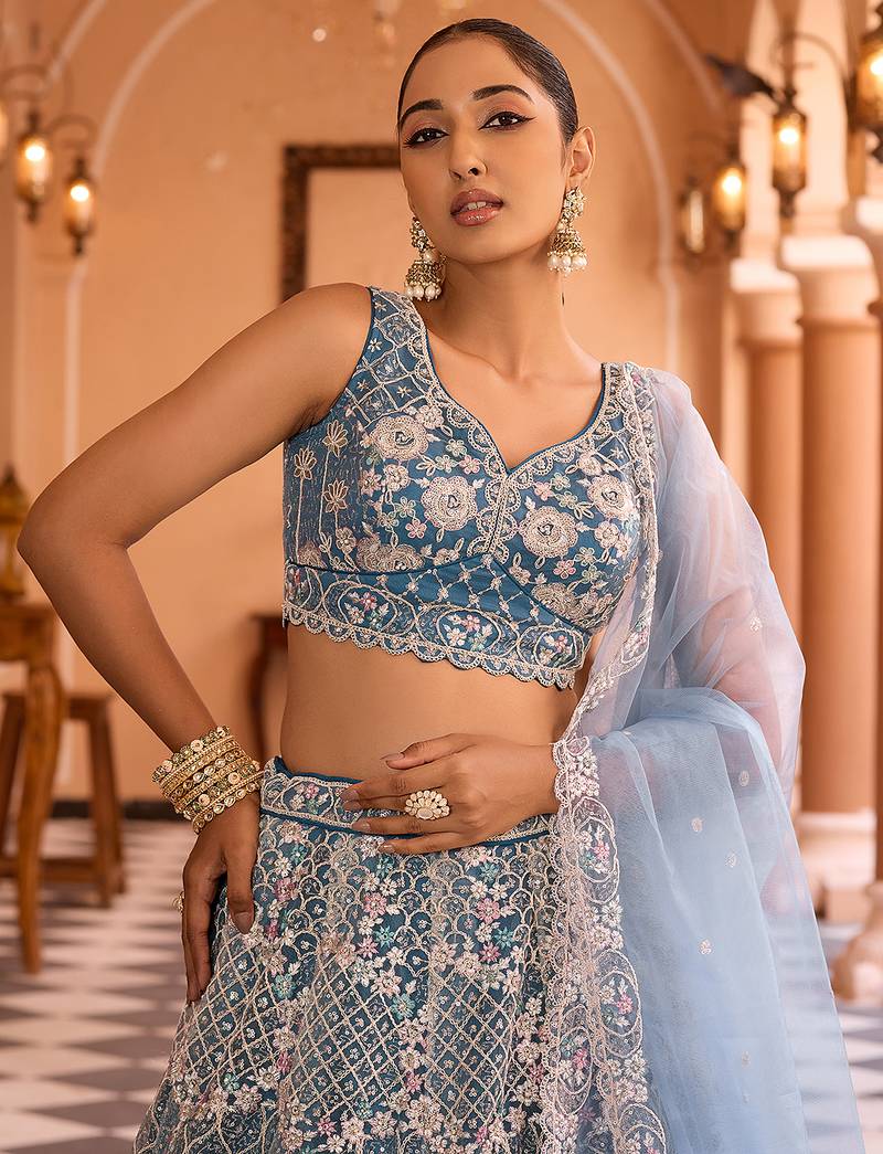 Teal net fabric sequins embroidery semi stitched lehenga & unstitched blouse with dupatta