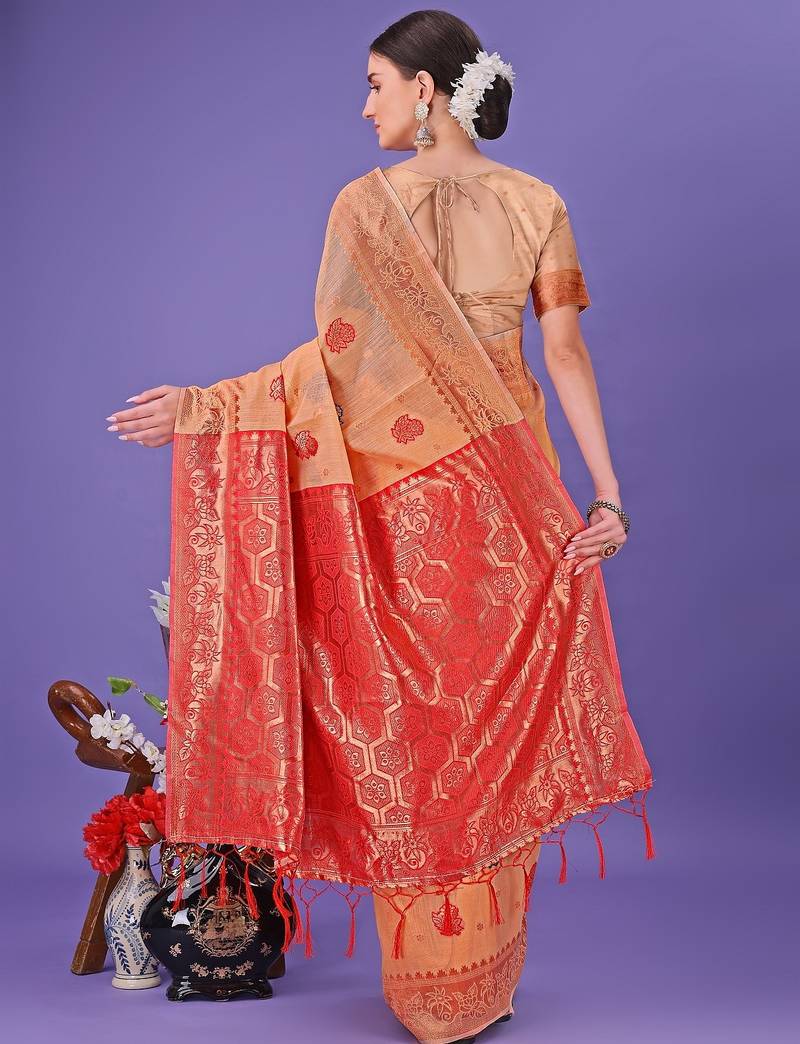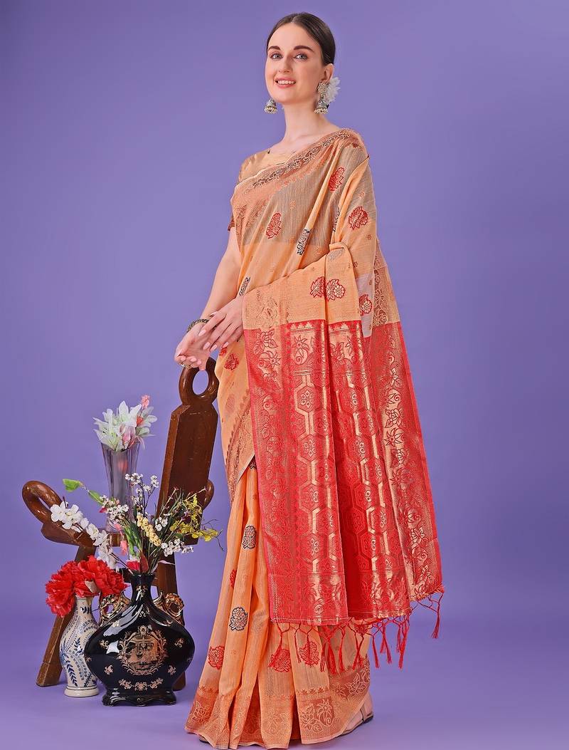 | Product Name | Orange Color Linen Cotton Zari Weaving Work Saree | |