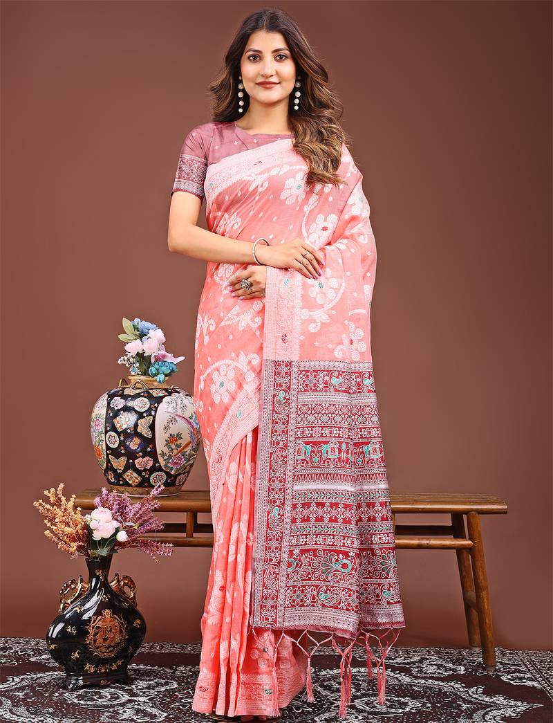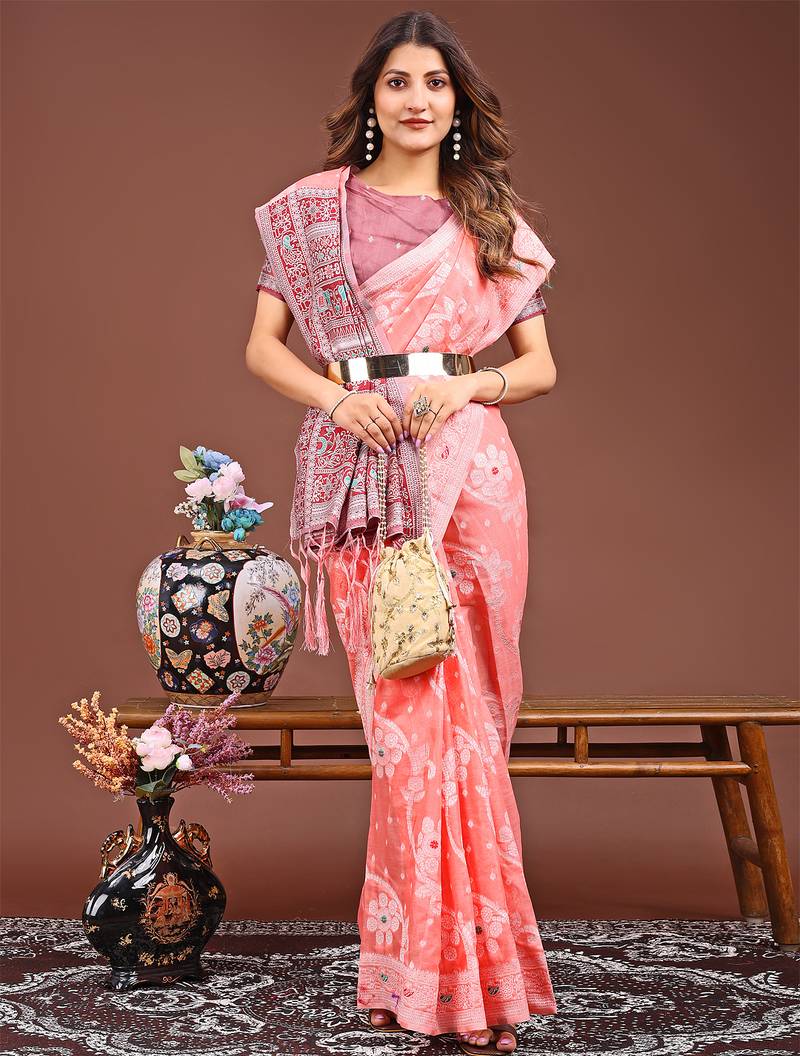 | Product Name | Peach Color Linen Cotton Saree With Blouse | |