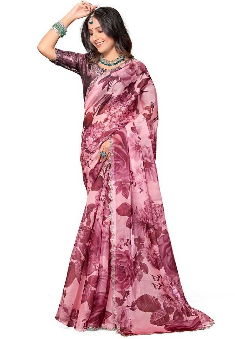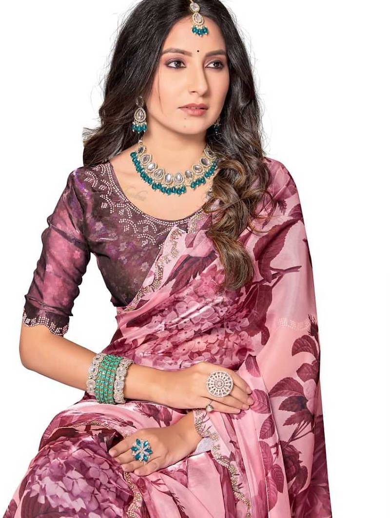 Pink color orgenza digitial printed with zircon work saree and blouse