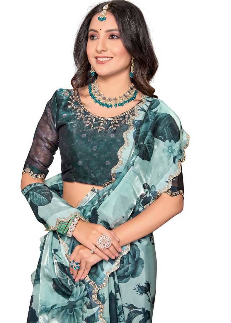 Sky blue color orgenza digitial printed with zircon work saree and blouse