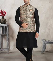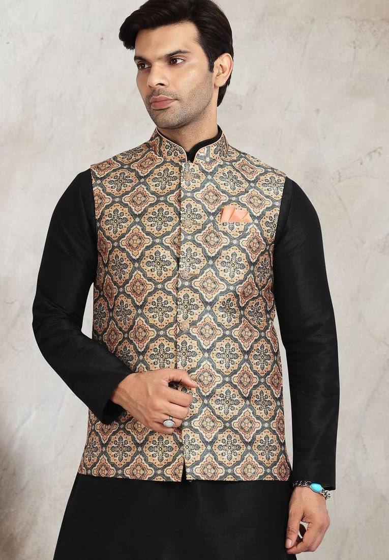 Product Name Beige Printed Banarasi Silk 3 Peice Jacket Set For Men