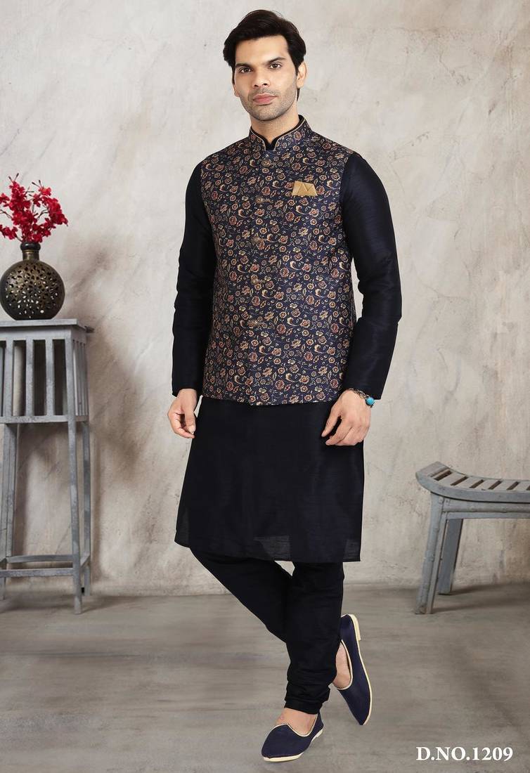 Product Name Blue Printed Banarasi Silk 3 Peice Jacket Set For Men
