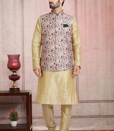 Beige printed banarasi silk 3 peice jacket set for men