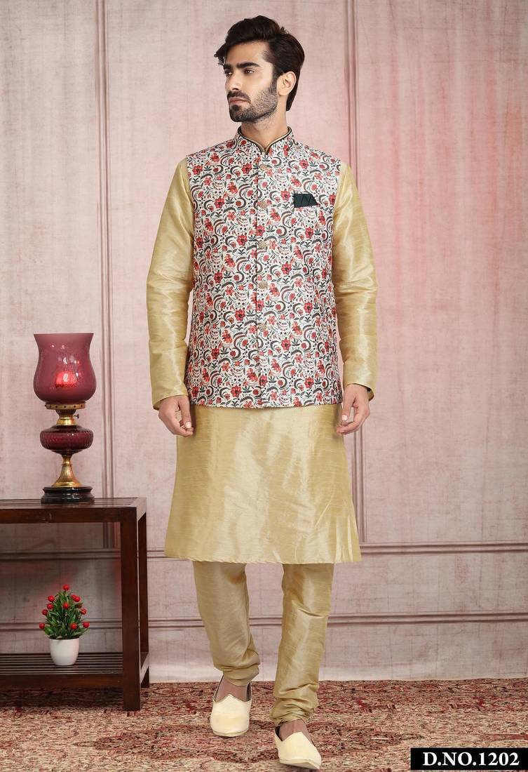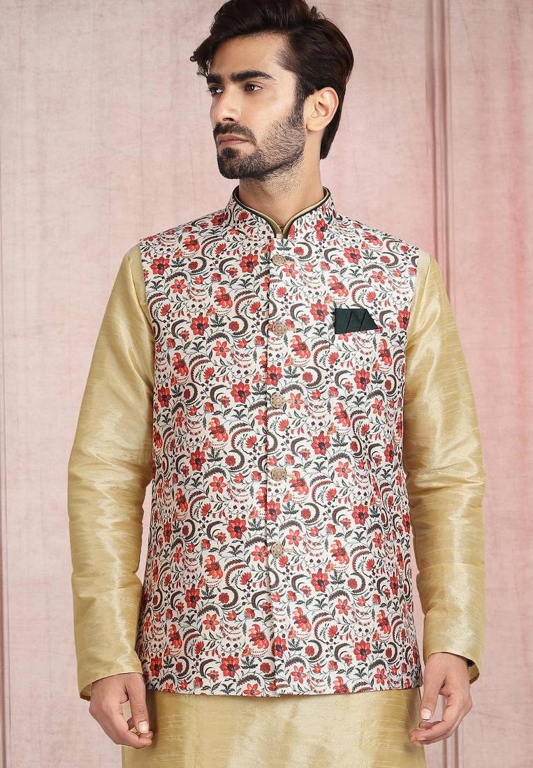 Product Name Cream Printed Banarasi Silk 3 Peice Jacket Set For Men