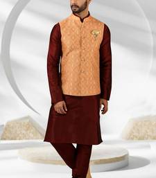 Dark peach jacquard banarasi silk 3 peice jacket set for men