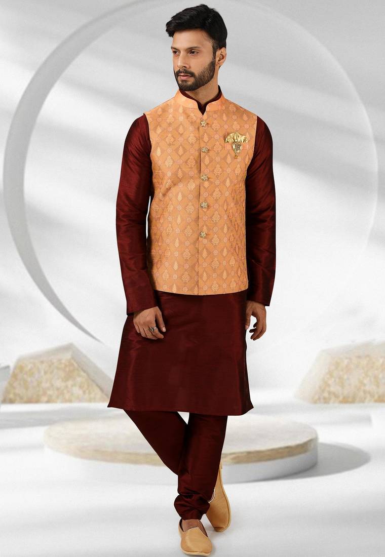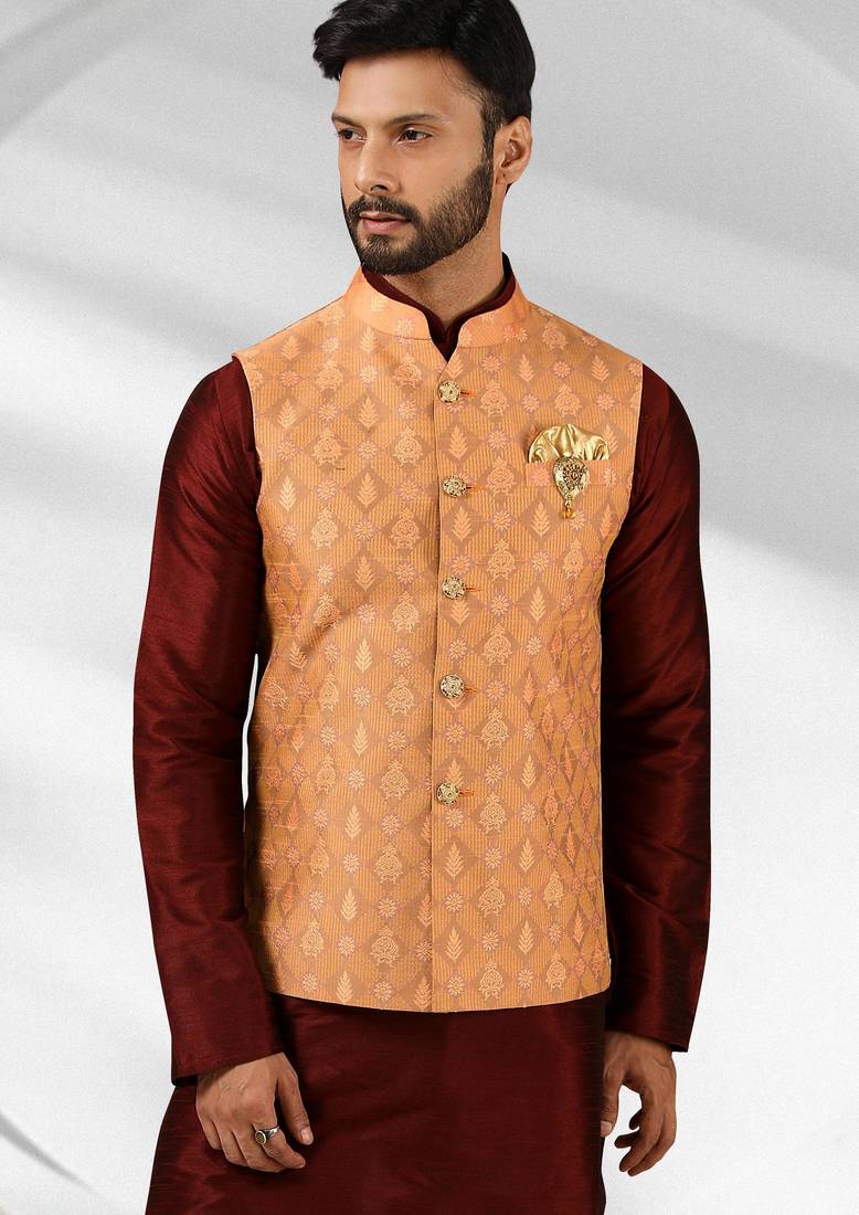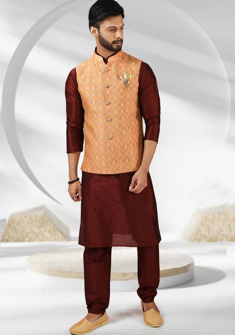 Product Name Dark Peach Jacquard Banarasi Silk 3 Peice Jacket Set For Men