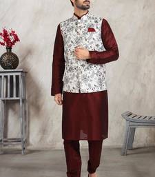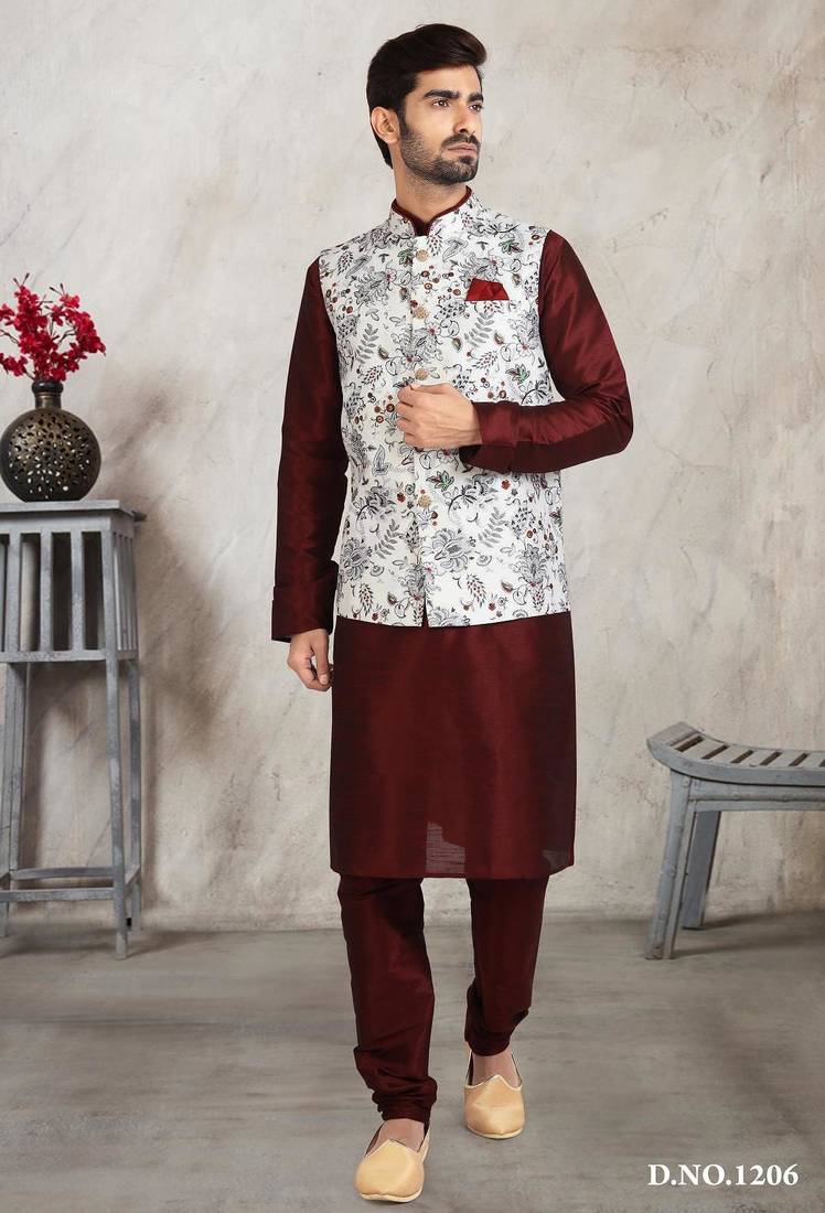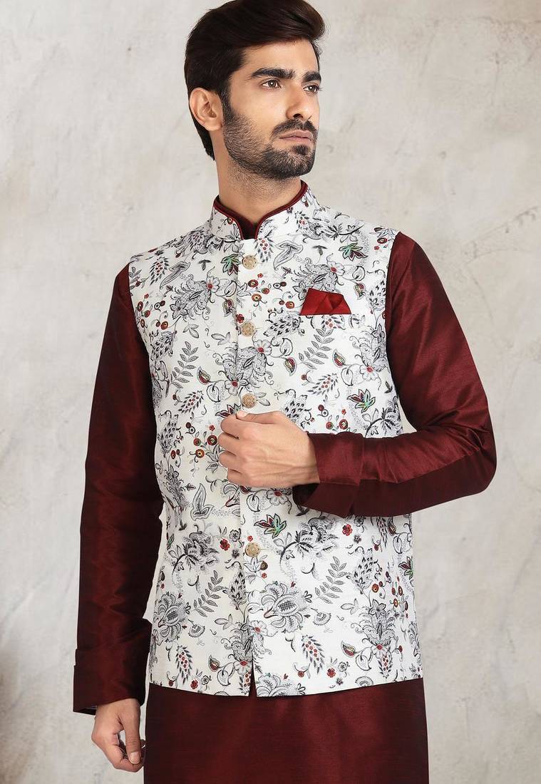 | Product Name | Off Whte Printed Banarasi Silk 3 Peice Jacket Set For Men | |