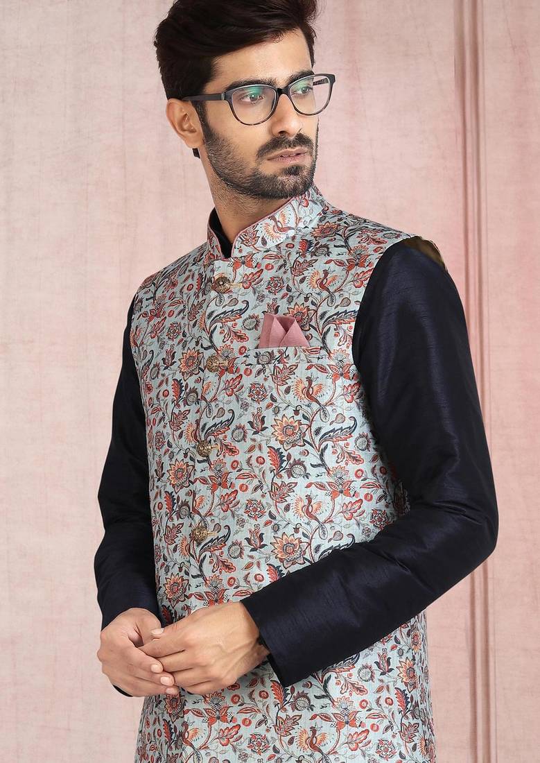 | Product Name | Teal Green Printed Banarasi Silk 3 Peice Jacket Set For Men | |