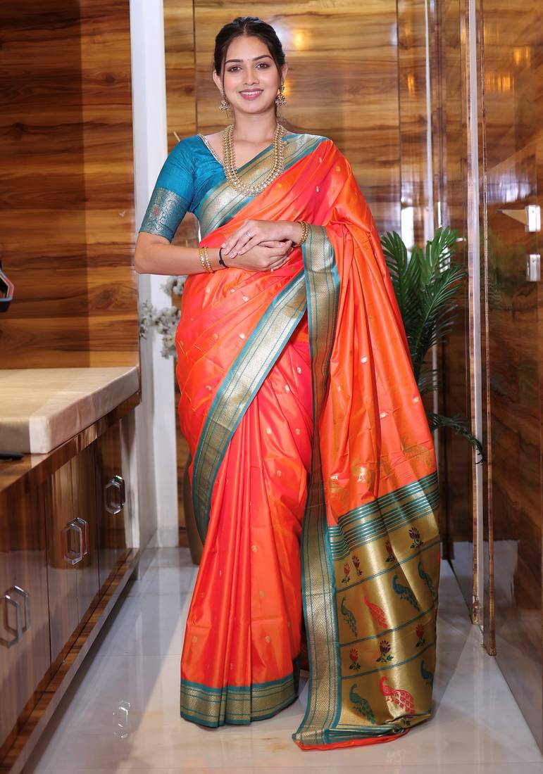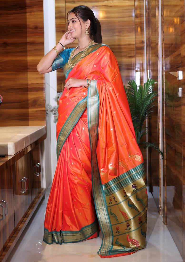 Product Name Orange Woven Paithani Silk Blend Saree With Blouse