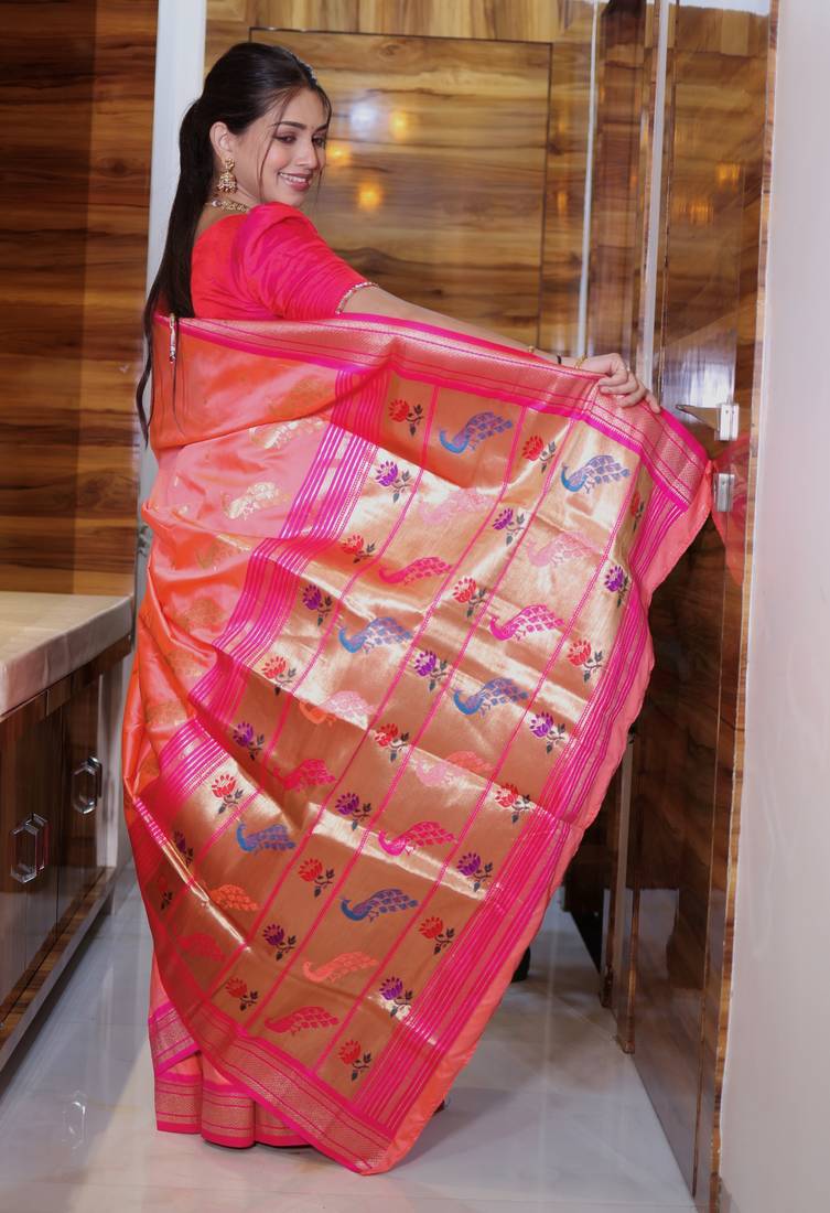 Peach woven paithani silk blend saree with blouse
