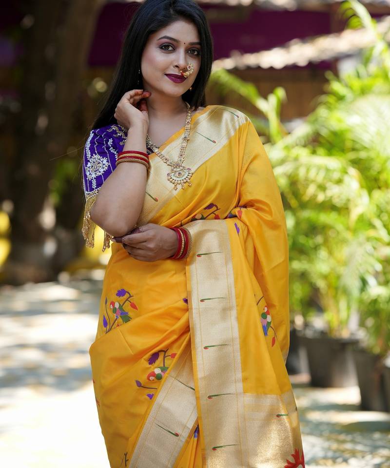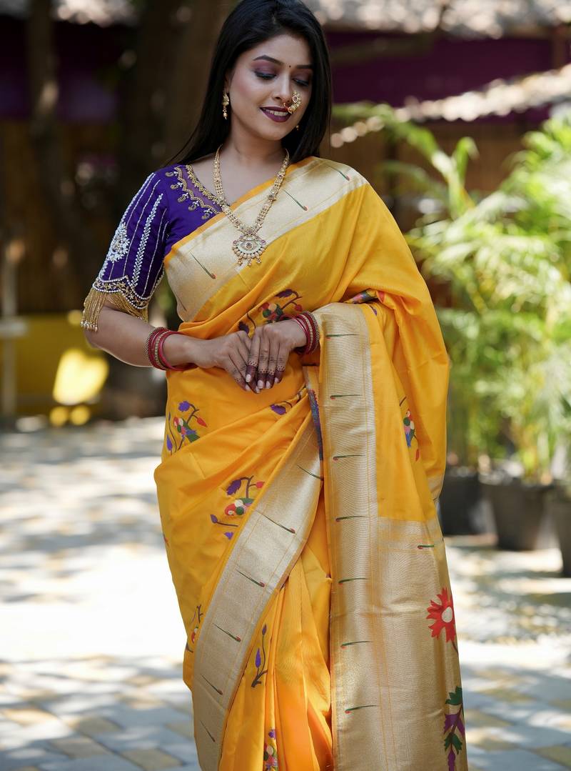 Yellow woven paithani silk blend saree with blouse