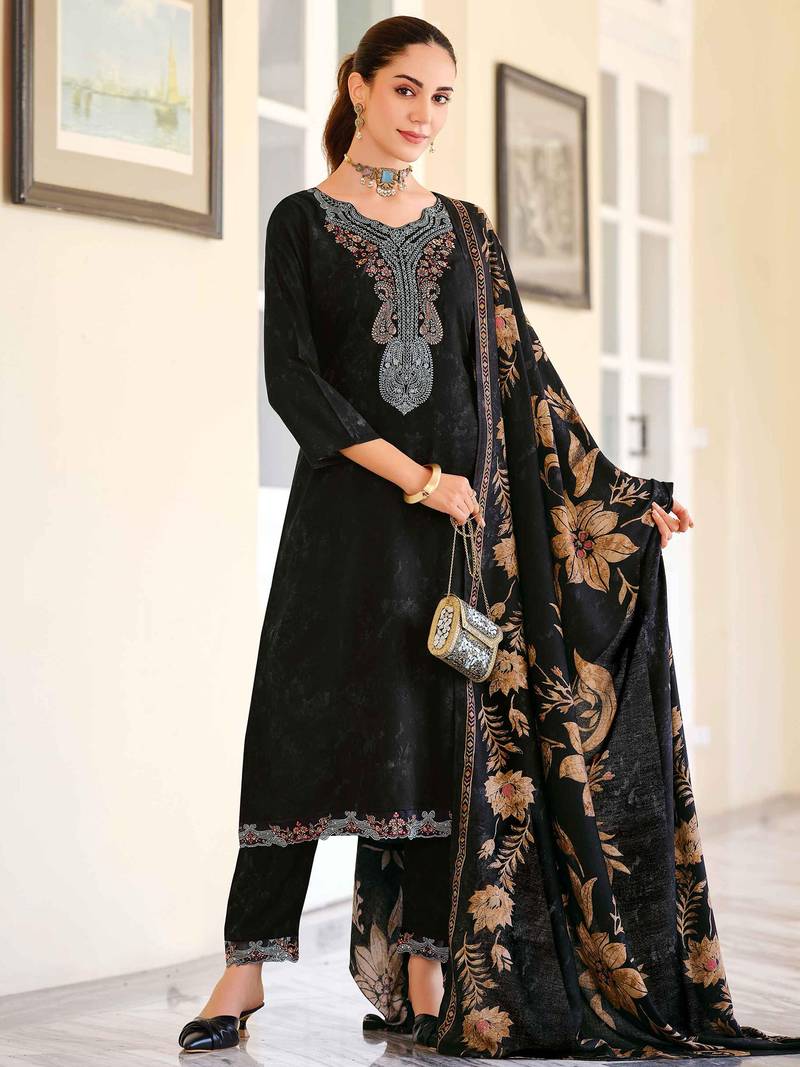 Stylee lifestyle black pashmina embroidered dress material unstitched