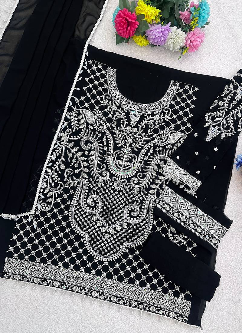 Black embroidered beads & sequence work heavy georgette festive salwar kameez semi stitched