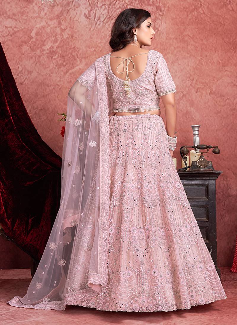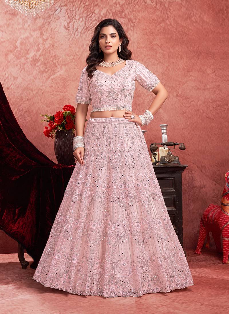 Product Name Pink Mirror Zarkan With Hand Work Net Lehenga