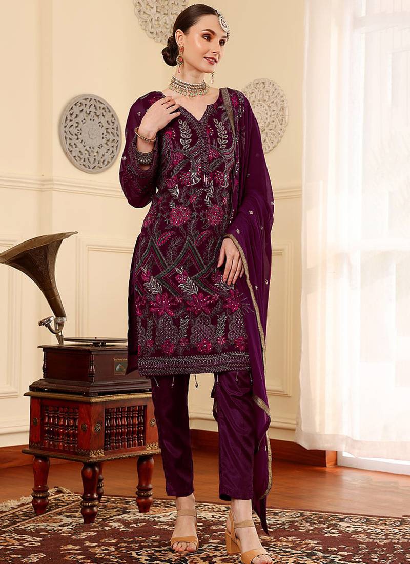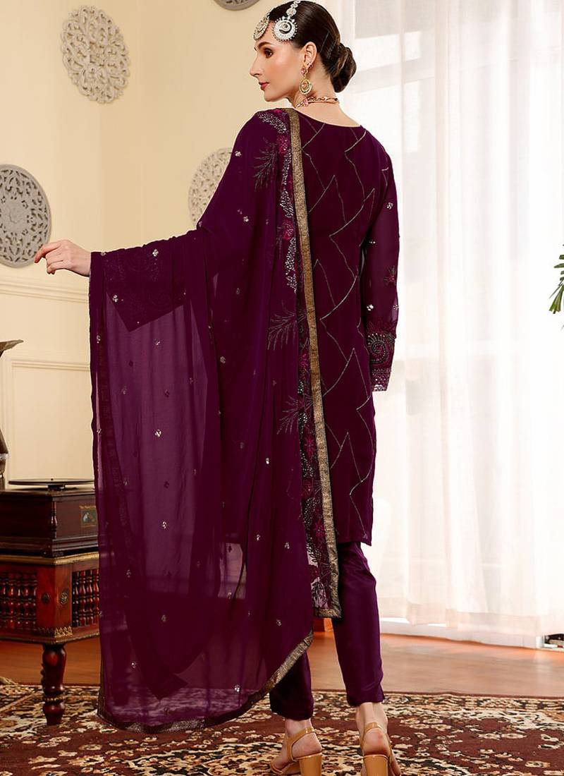 | Product Name | Wine Embroidered Faux Georgette Pakistani Suit | |