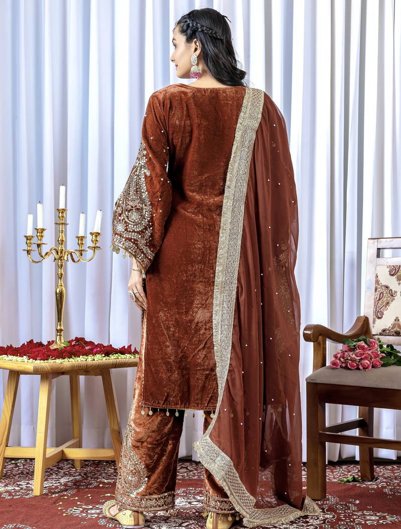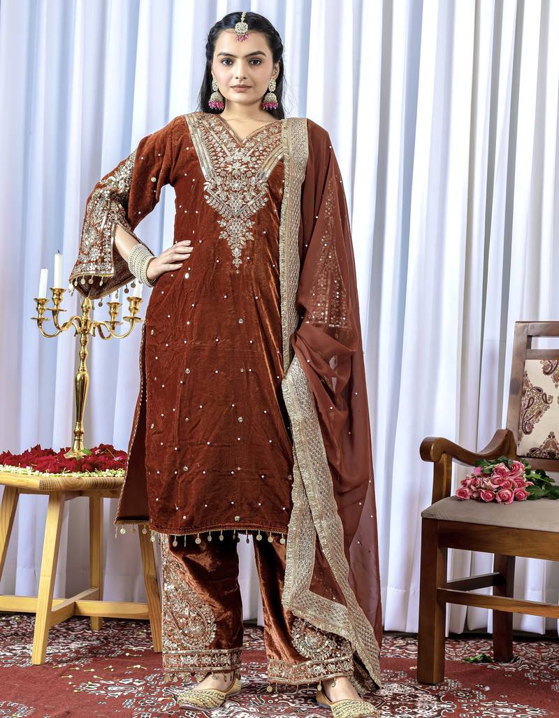 | Product Name | Brown Color Velvet Silk Embroidery Work Party Wear Suit Full Stitched Free Size | |