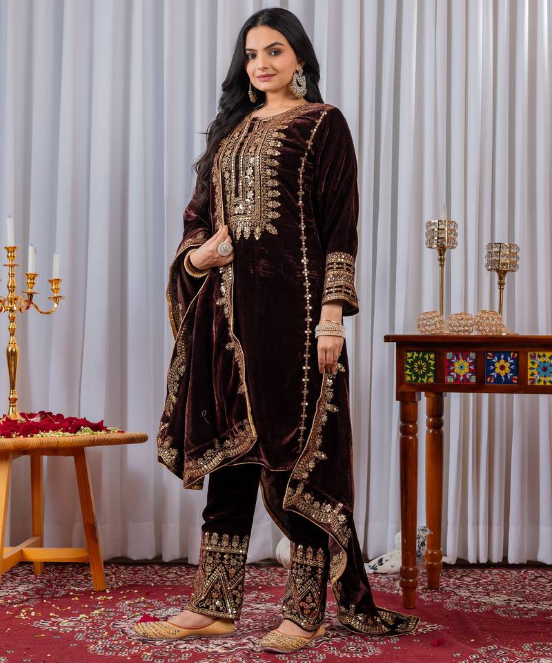 | Product Name | Maroon Color Velvet Designer Embroidery Work Party Wear Suit Full Stitched Free Size | |