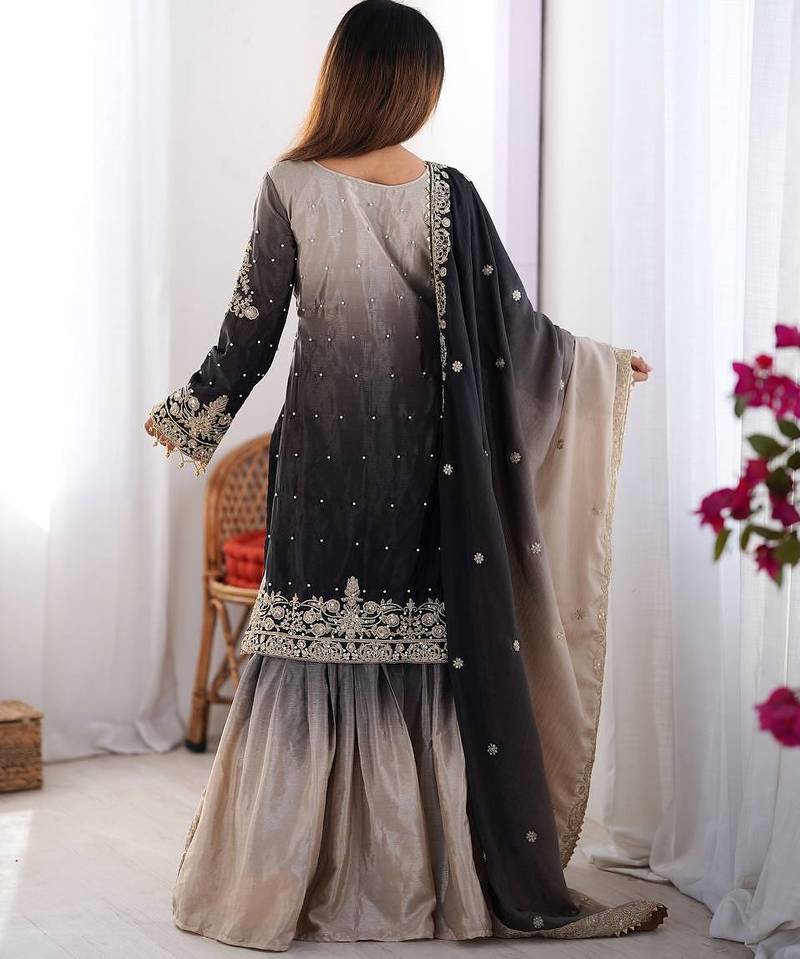 Multi color chinnon silk heavy embroidery work wedding wear sharara suit- full stitched free size