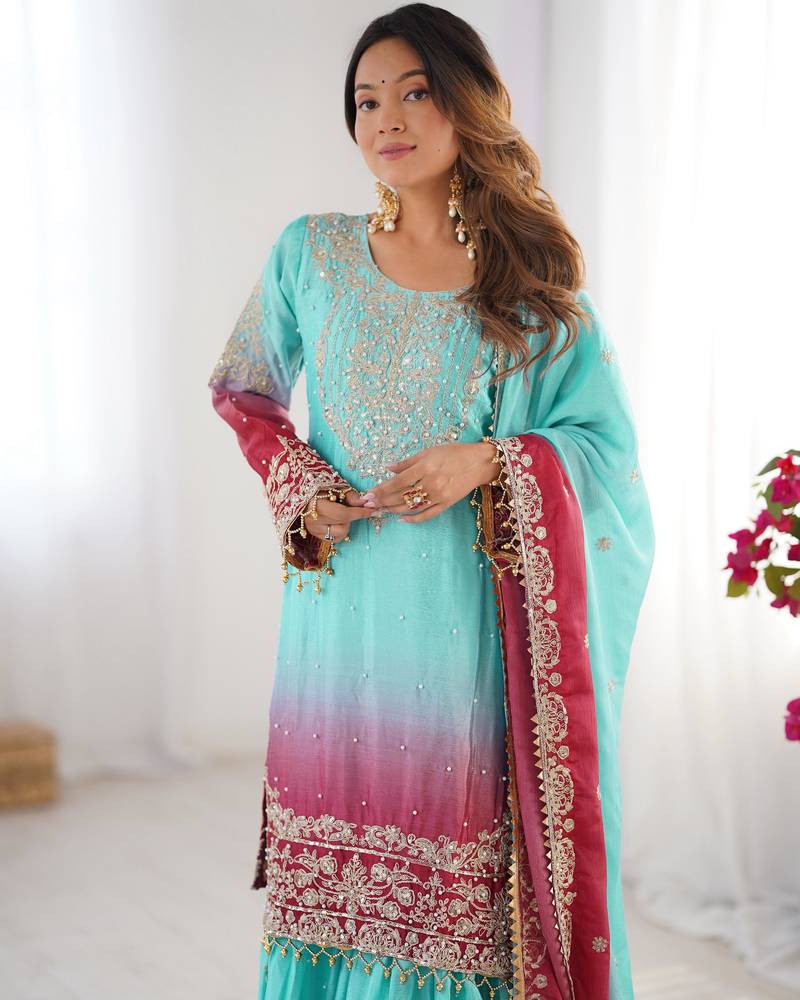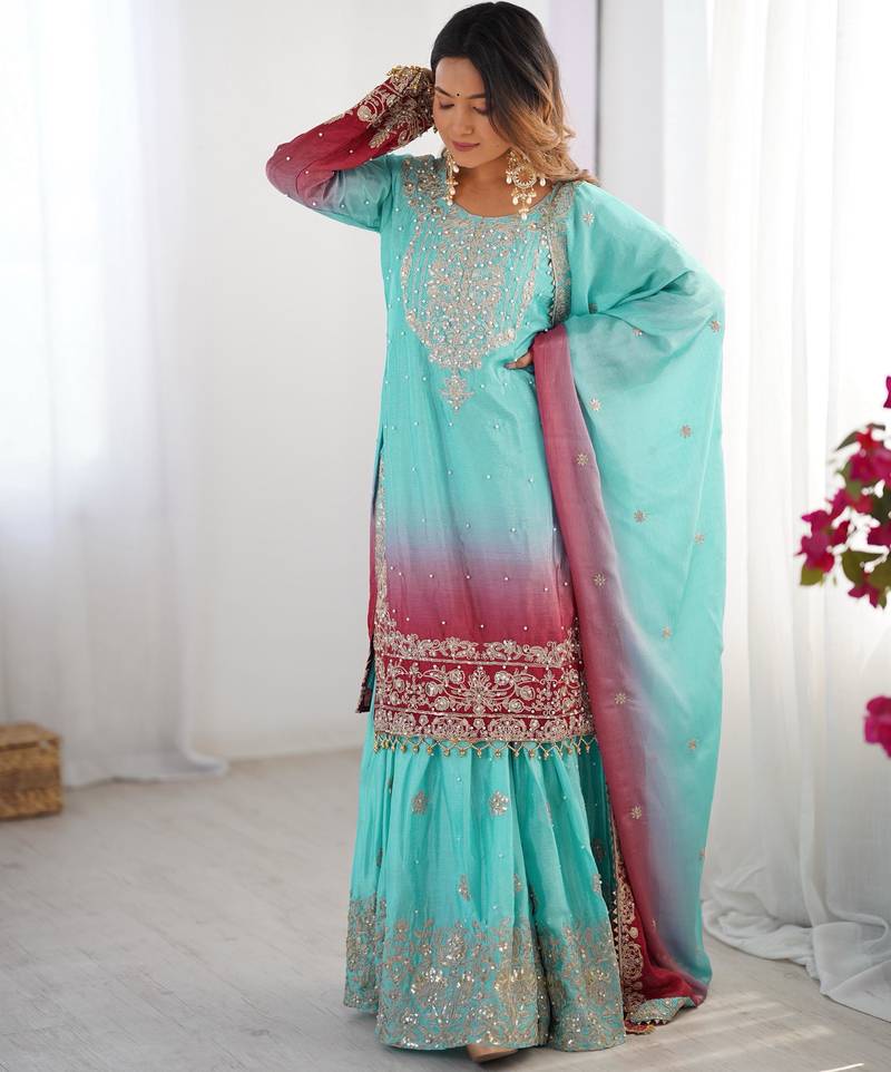Multi color chinnon silk heavy embroidery work wedding wear sharara suit- full stitched free size