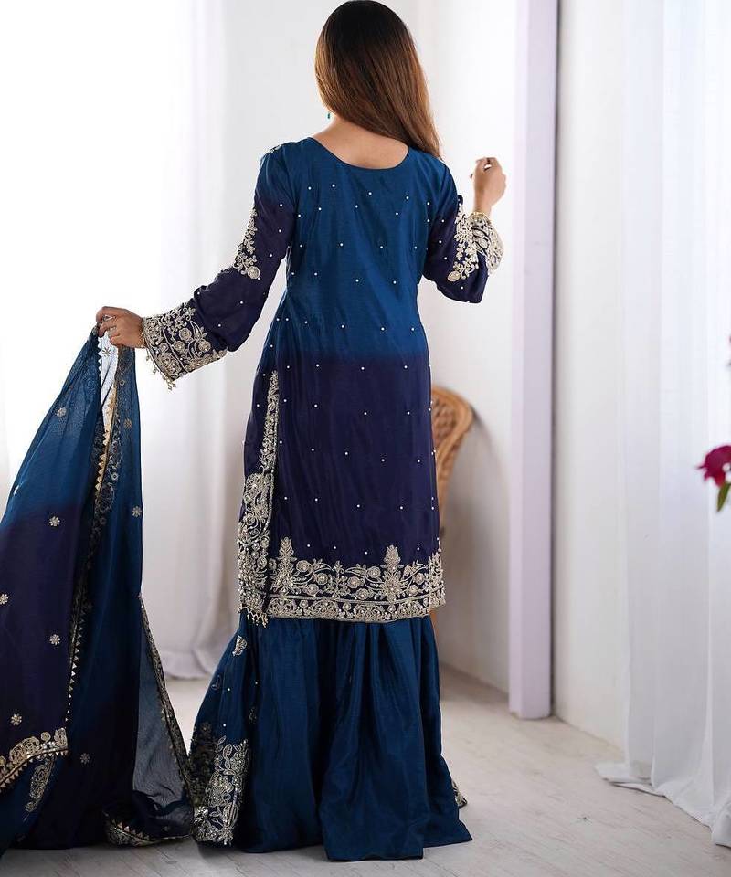 | Product Name | Multi Color Chinnon Silk Heavy Embroidery Work Wedding Wear Sharara Suit Full Stitched Free Size | |