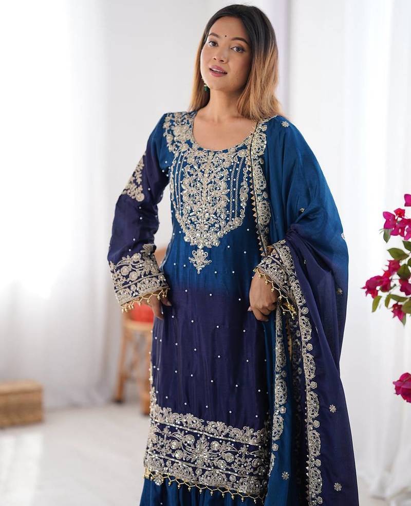 Multi color chinnon silk heavy embroidery work wedding wear sharara suit- full stitched free size
