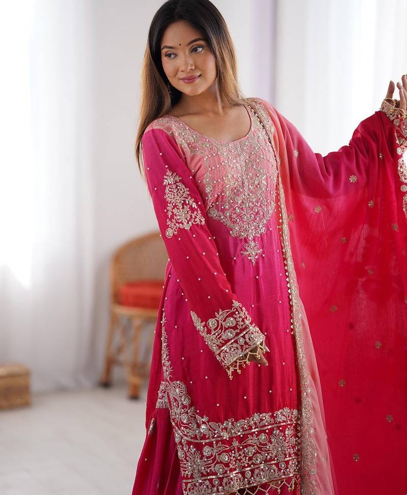 Multi color chinnon silk heavy embroidery work wedding wear sharara suit- full stitched free size