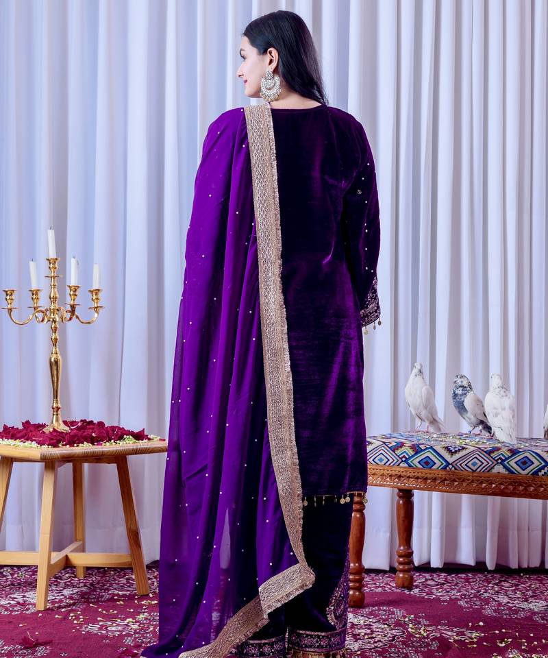 | Product Name | Purple Color Velvet Silk Embroidery Work Party Wear Suit Full Stitched Free Size | |