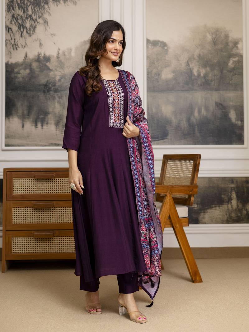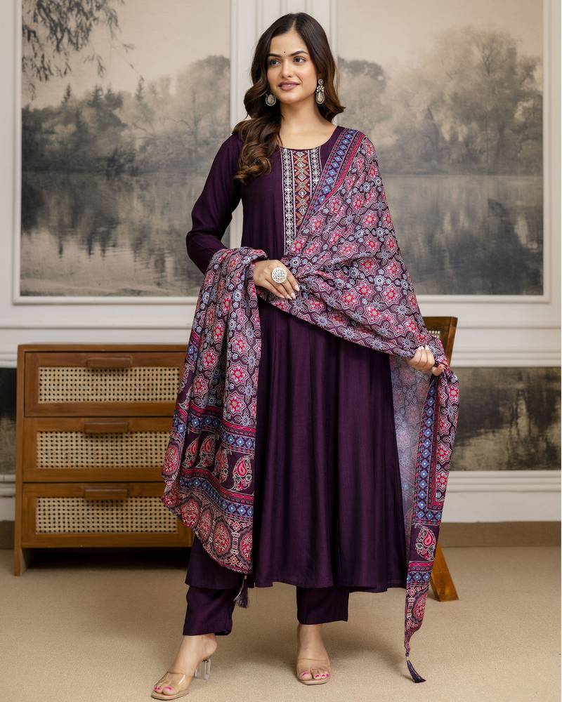 Art silk hand work embroidery anarkali kurta pant with printed dupatta set stitched