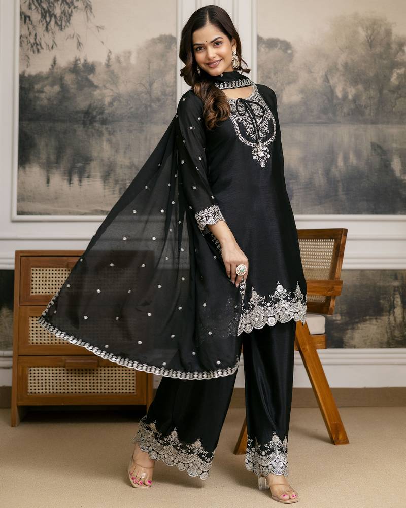 Women's chinon embroidery sequence work kurta palazzo with dupatta for women stitched