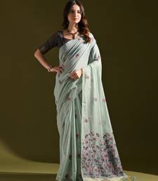Aqua muga cotton saree with floral weaving & resham woven pallu | traditional cotton-silk saree with tassels & blouse