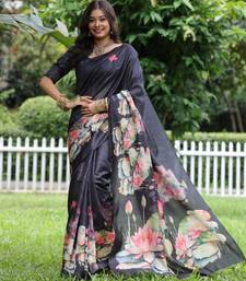 black tussar art silk lotus print saree with designer pallu & floral border with running blouse