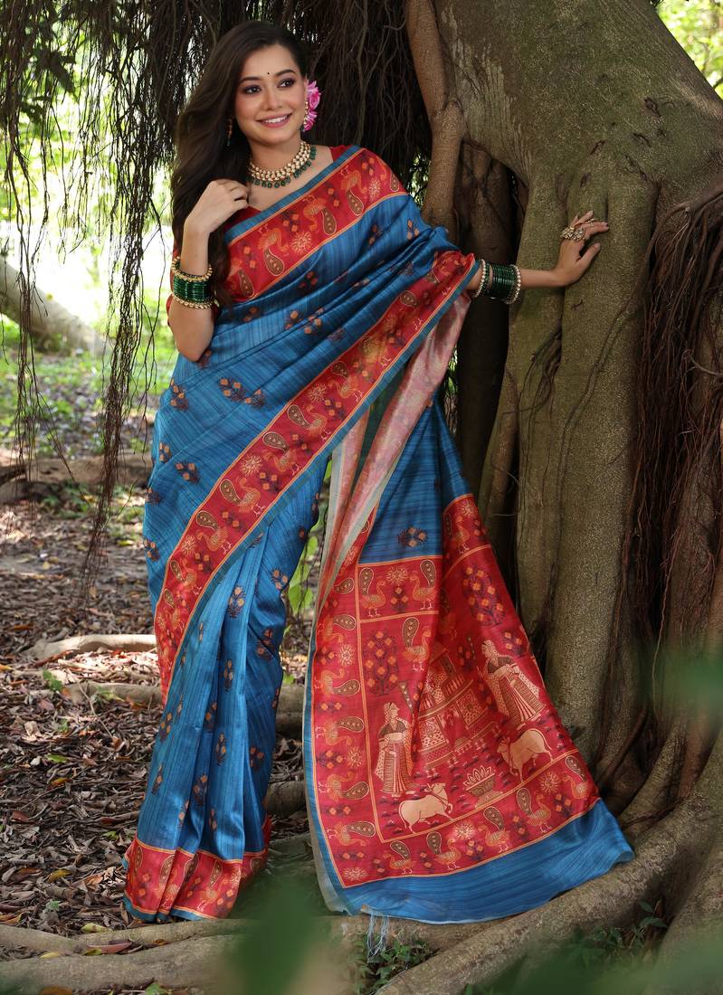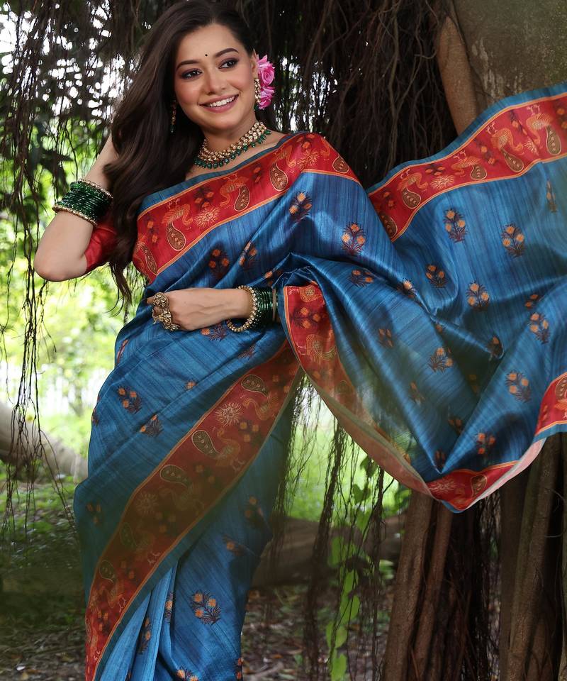 | Product Name | Blue Soft Tussar Art Silk Peacock Design Saree With Traditional Printed Pallu & Contrast Border – With Blouse | |