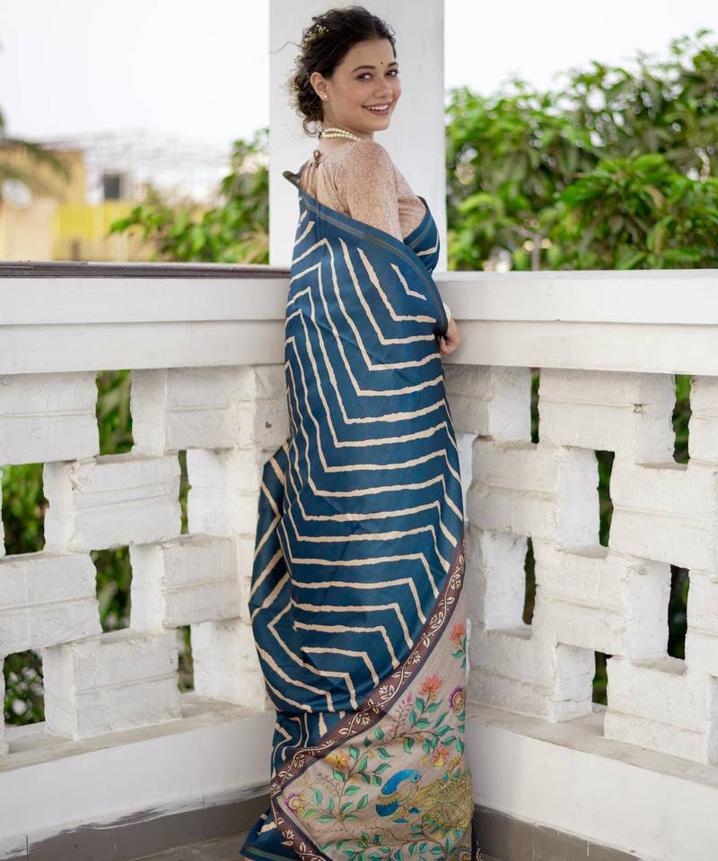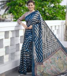 Blue tussar art silk leriya pattern saree with woven zari border & kalamkari work pallu – comes with blouse