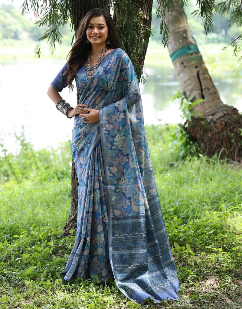 Blue tussar silk saree with hand-style printed design & zari border | printed pallu with tassels | running blouse piece