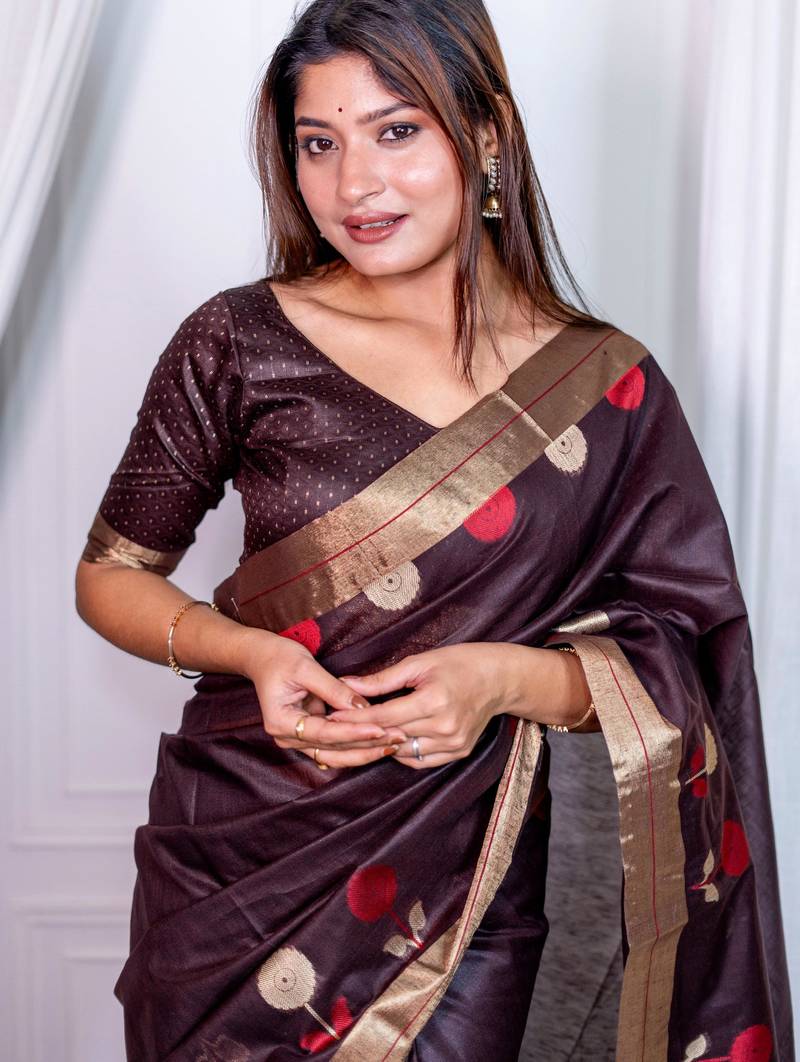 | Product Name | Brown Linen Silk Blend Saree With Jamdani Weaving Border & Floral Woven Design With Zari Pallu And Brocade Blouse | |