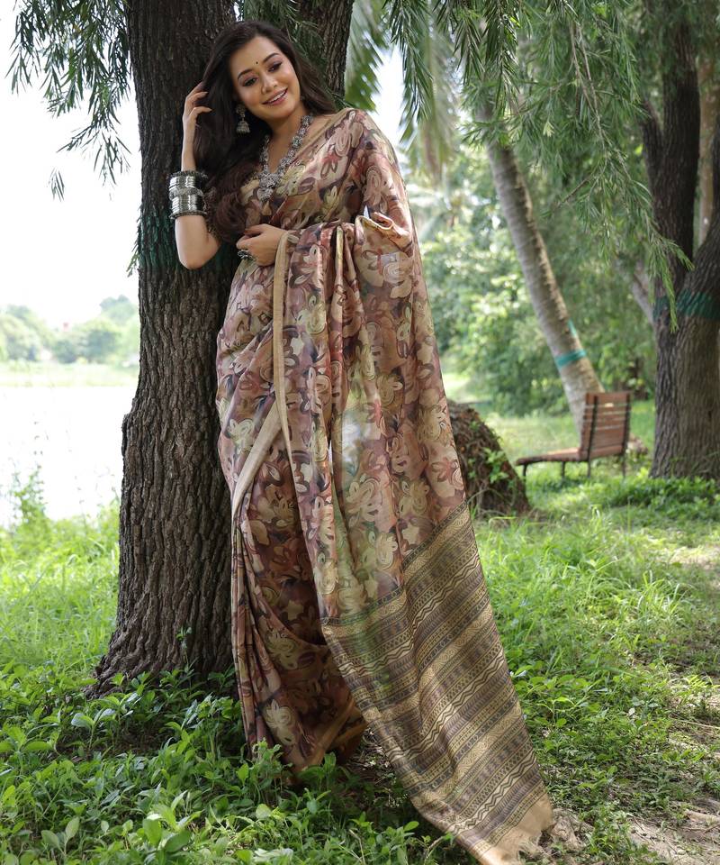 Soft Desi Tussar Silk Saree With Premium Hand Style Printed Pattern