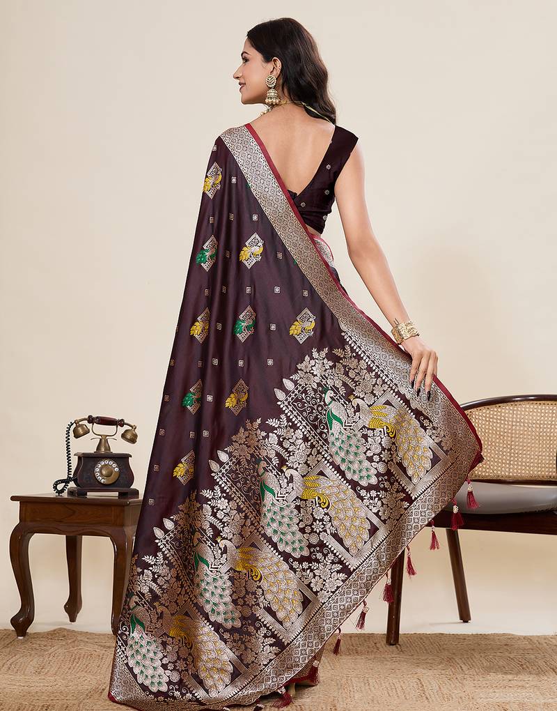 Dark maroon soft silk blend two tone satin saree with full border zari mina kari work & rich designer pallu
