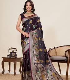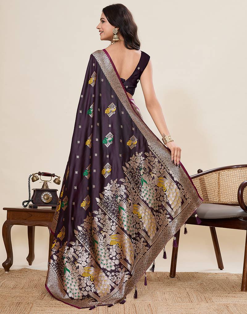 Deep wine soft silk blend two tone satin saree with full border zari mina kari work & rich designer pallu