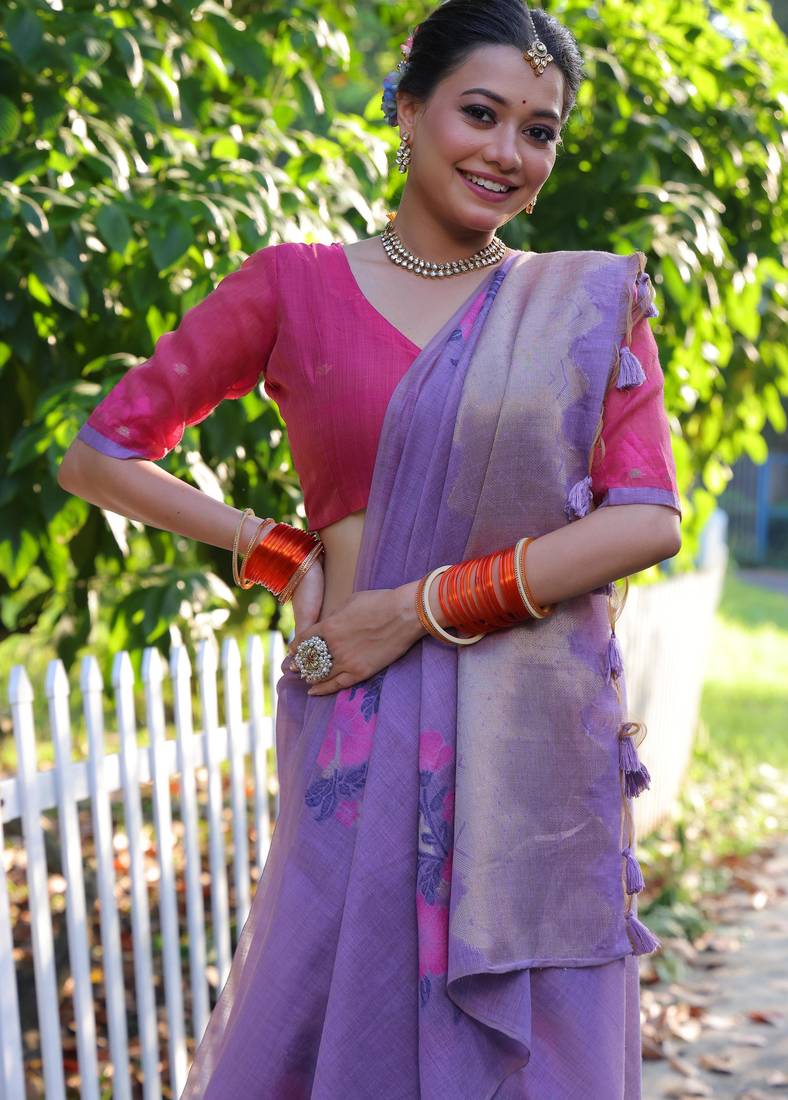 | Product Name | Lavender Soft Muga Cotton Resham Woven Saree With Jamdani Pallu, Zari Touch Up & Blouse – Traditional Weaving Design | |