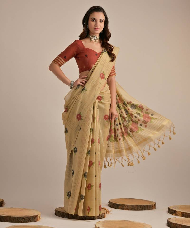 | Product Name | Light Beige Muga Cotton Saree With Traditional Pallu Weaving & Floral Buttas | Lightweight Daily Wear Saree With Tassels | |
