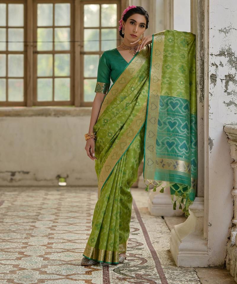 | Product Name | Light Green Soft Raw Art Silk Pochampally Ikat Weaving Saree With Resham Jal & Zari Border Traditional Saree With Blouse | |