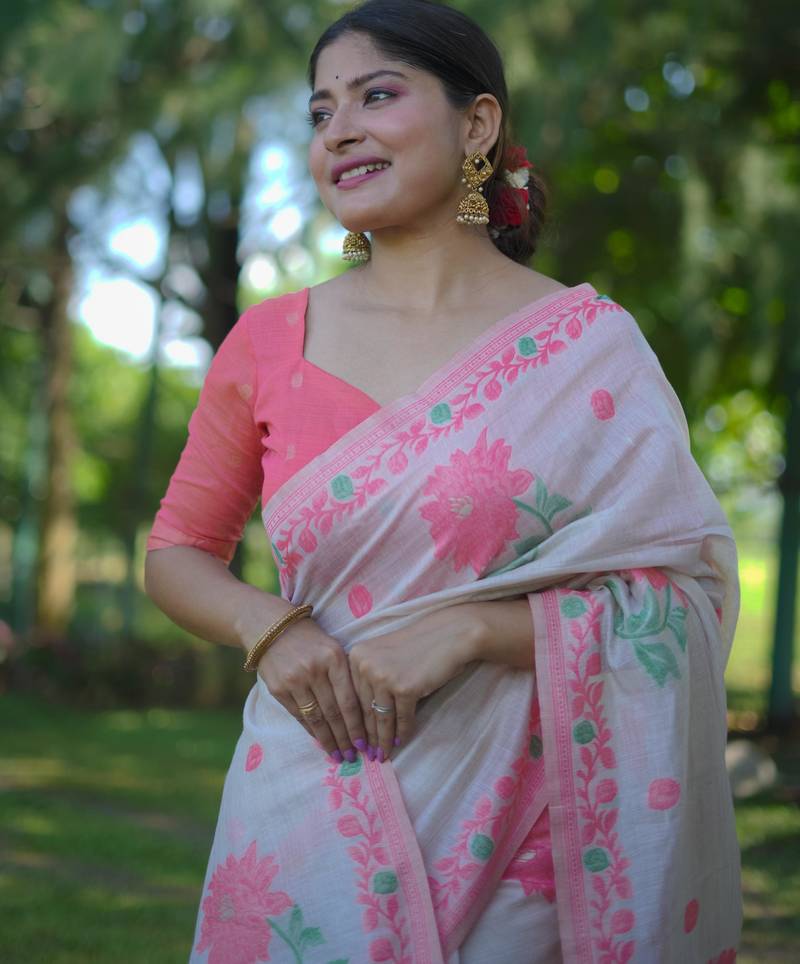 Light pink muga cotton jamdani weaving saree with resham buttas & fancy pallu with blouse