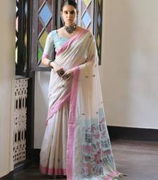 Light pink muga cotton saree with warli weaving pallu & contrast border | handwoven butta design | with blouse