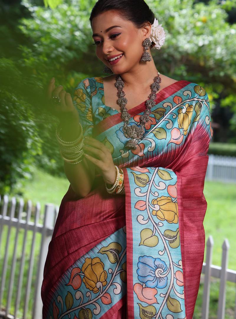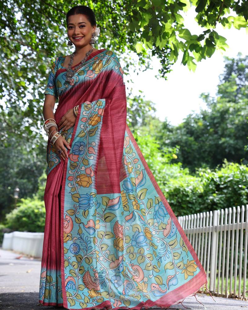 Maroon tussar silk kalamkari printed saree with traditional pallu & temple border | tussar silk saree + blouse