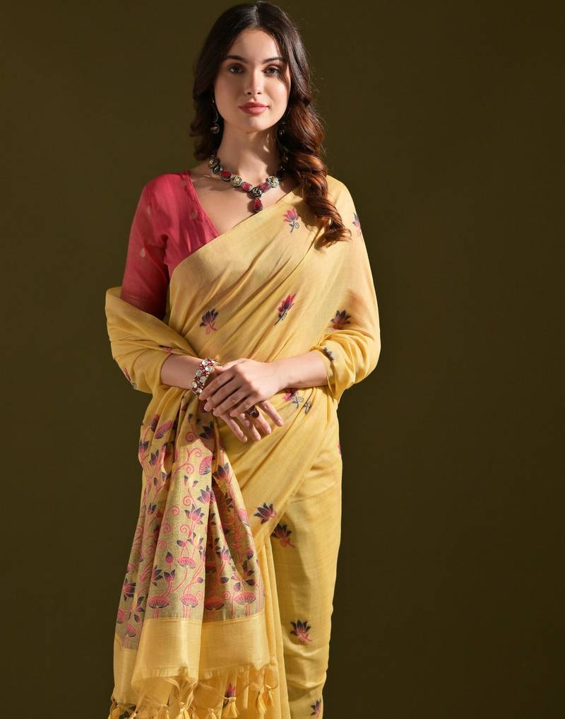 Mustard muga cotton saree with floral weaving & resham woven pallu | traditional cotton-silk saree with tassels & blouse