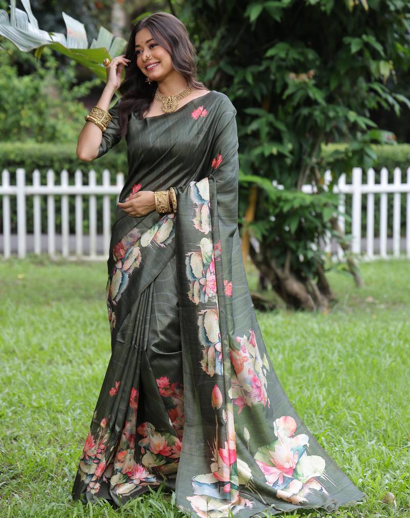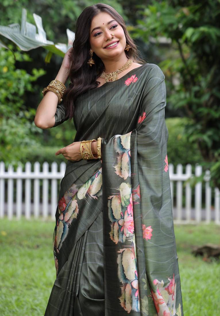 Olive tussar art silk lotus print saree with designer pallu & floral border with running blouse