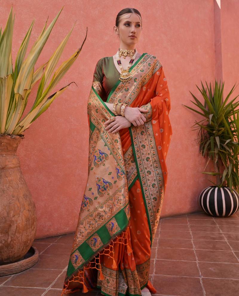 Product Name Orange Paithani Silk Saree With Elegant Contrast Border & Fancy Tassels | Handwoven Look Designer Saree With Blouse