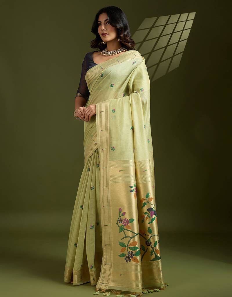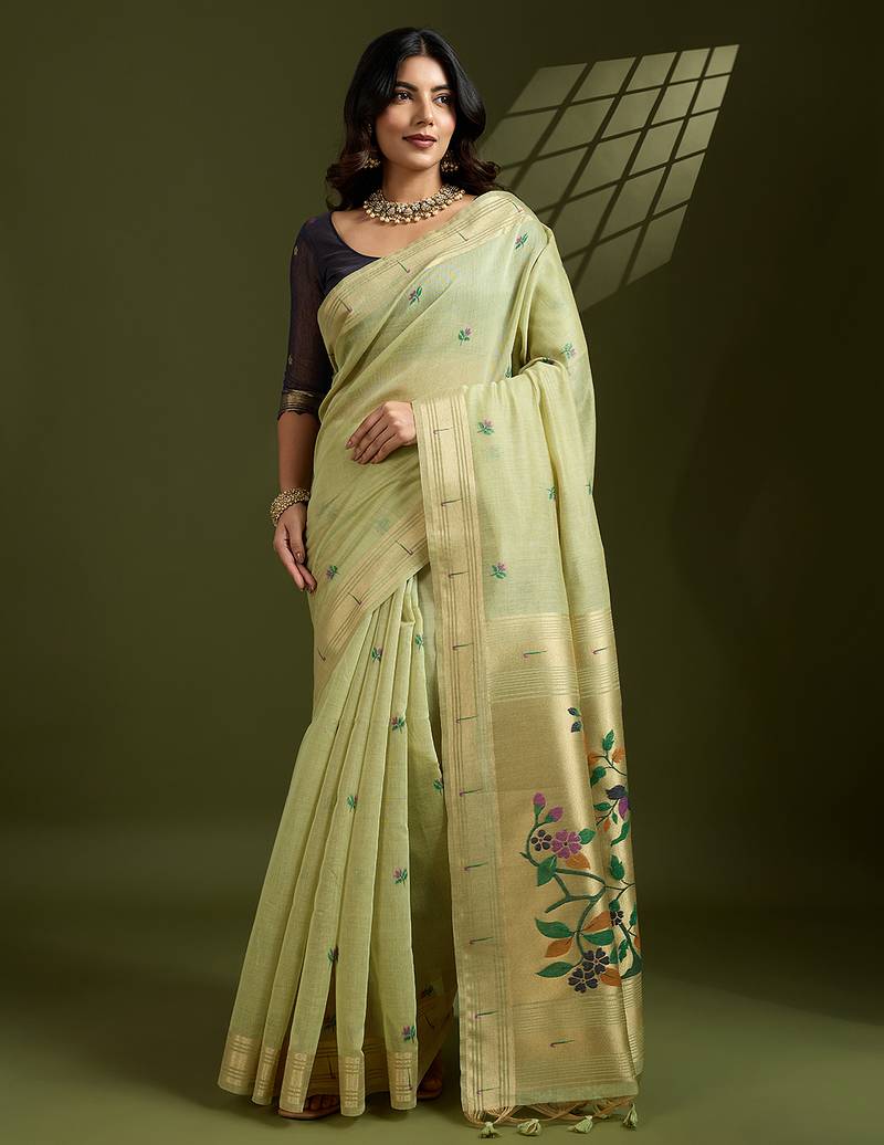 Pastel green muga cotton silk paithani saree with resham weaving pallu, muniya border & handwoven blouse piece
