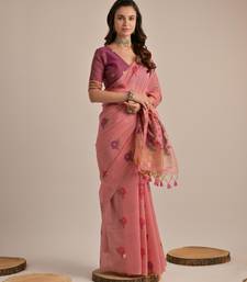 Pink muga cotton saree with motifs weaving pallu & floral buttas | lightweight daily wear saree with tassels & blouse
